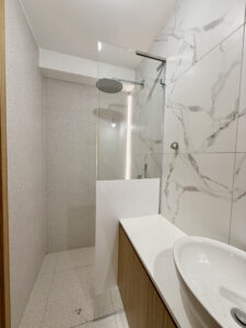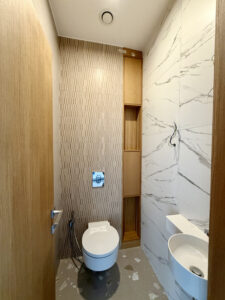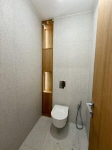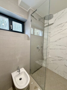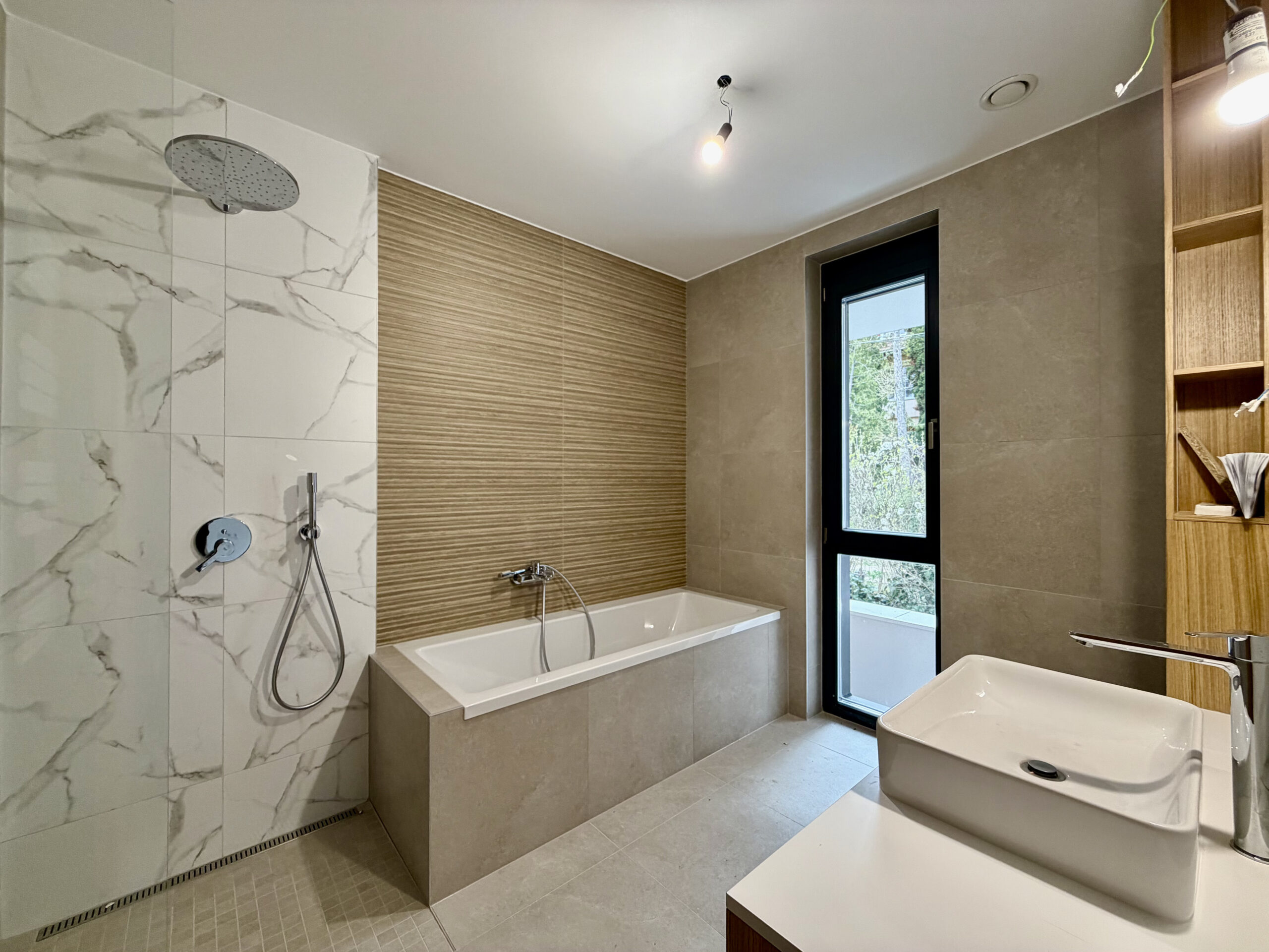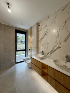 • természetes anyaghasználat: fa nyílászárók, travertin kő és okoume burkolatok